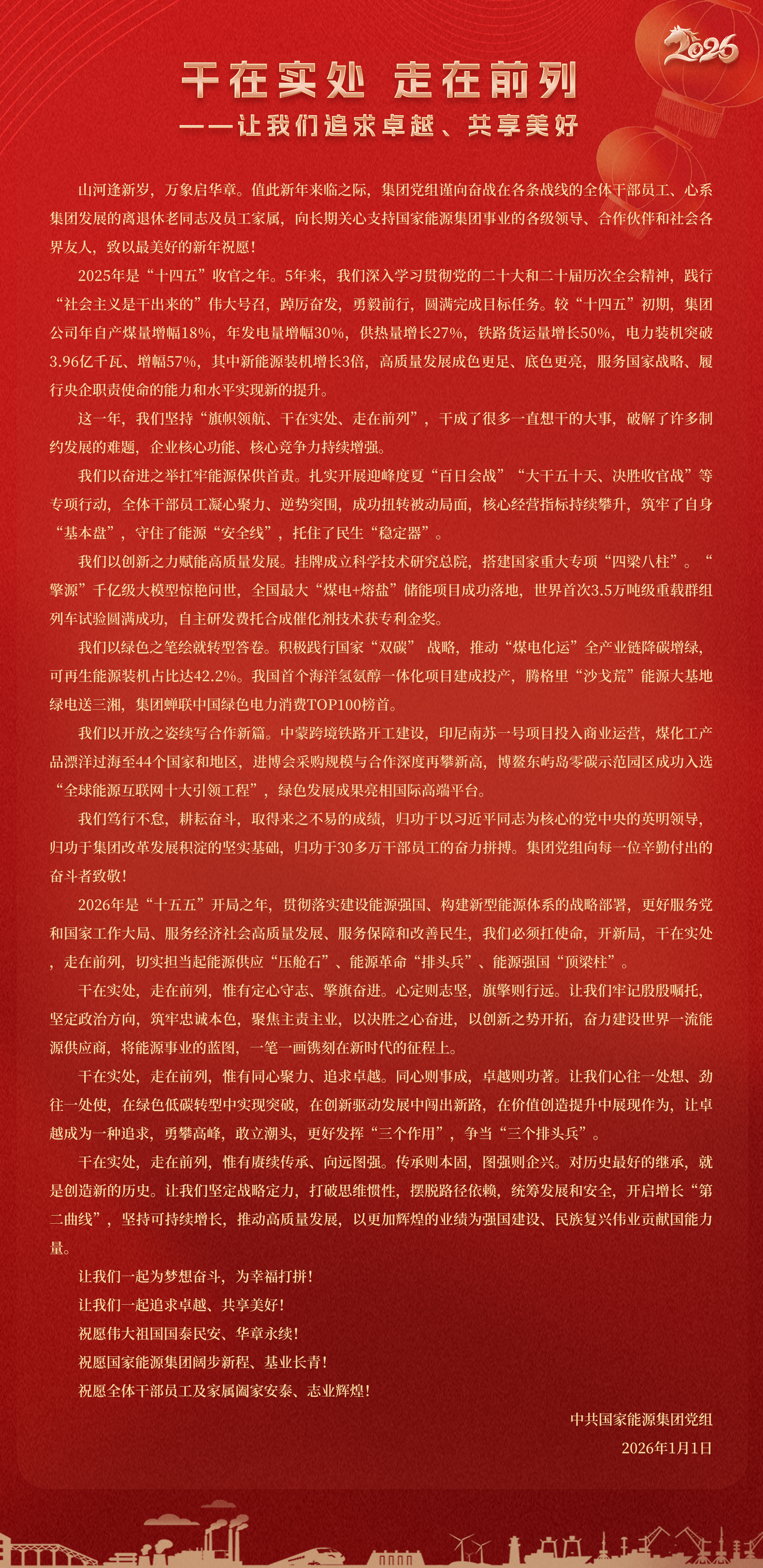 國家能源集團胸懷“國之大者”,增產增供、穩價穩市,積極服從服務國家戰略、保障國家能源安全、助力國民經濟穩增長,推動煤炭安全綠色智能、煤電清潔高效穩定、現代煤化工高端多元低碳、運輸物流協同一體、新能源多元創新規模化發展,全力擔當能源強國頂梁柱,能源供應壓艙石,能源革命排頭兵。
